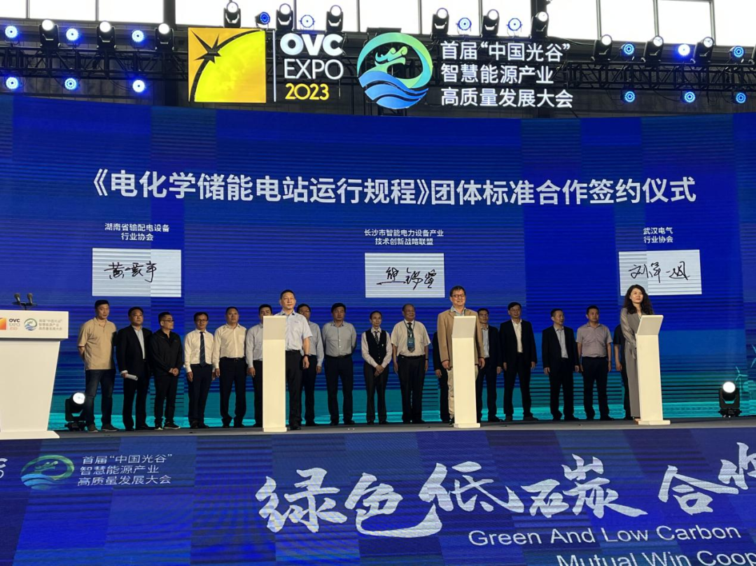 期间,武汉电气协会、湖南省输配电设备行业协会、长沙市智能电力设备产业技术创新战略联盟三方进行《电化学储能电站运行规程》团体标准合作协议签约仪式,携手推动储能行业标准化发展。该标准主要规定了电源侧、电网侧等规模化储能电站电力设备的运行操作、巡视检查验收、事故及异常情况处理等方面的基本要求,将为储能电站运营、管理、维护提供有力依据。