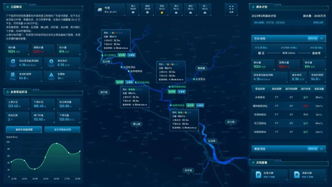 为有效降低汛期时洪水漫灌和洪涝灾害对生产、生活的影响,公司HZInfo3000闸泵集群智能管控系统可通过流域地形、气象、水文等数据,结合流域枢纽调度预案及监测数据对流域来水态势进行预报和预警,以流域泵站闸群的调度方案为核心,利用一二维水动力、水量平衡等数理模型对来水和枢纽调度进行预演,形成预案。