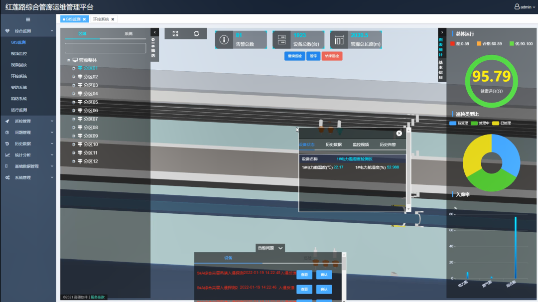 乐竞(中国)一站式服务平台研发的HZInfo3000_UT综合管廊监控管理平台完美破解综合管廊管理的压力与难题,该平台充分利用云计算、物联网、GIS+BIM、大数据等高新技术,集环境设备监控、安防监控系统、通信系统、消防监控系统、巡检管理、设备管理、出入廊管理系统为一体,实现对管廊的集中管理和统一控制,保障管廊安全、高效、规范运行。