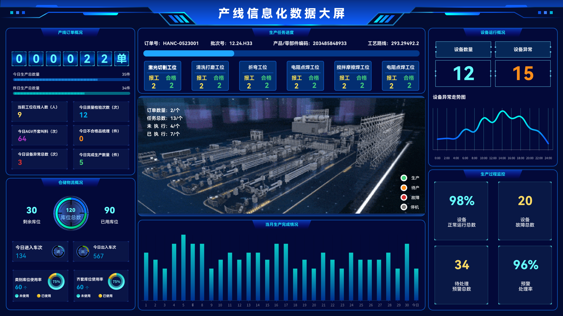 产线信息化注重生产数据的采集、工艺任务下达、设备管理、工艺管理、人员管理、成本管理、过程和质量管理等需求,通过配备数据可视化硬件,实时展示产线生产数据及相关分析结果
