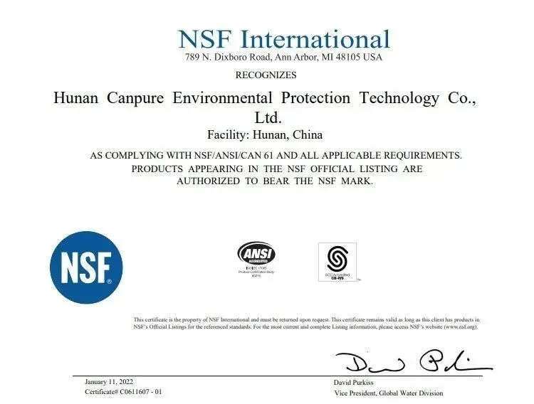 NSF(National Sanitation Foundation) International成立于1944年,是一个全球性的独立公共卫生和安全组织。NSF致力于公共卫生、安全、环境保护领域的标准制订、产品测试和认证服务工作,是公共卫生与安全领域的权威机构。NSF International于2005年和2011年先后成立了其中国地区的业务营运中心: NSF International中国公司(获得了中国认监委的认可)及中国实验室(获得了ISO/IEC 17025认可),协助国内客户符合国际贸易进出口方面的安全、质量、诚信和监管要求。NSF/ANSI/CAN 61建立了大多数饮用水系统部件的健康影响标准,经过此认证可确保产品满足美国和加拿大的监管要求,甚至于许多其他国家的测试要求。