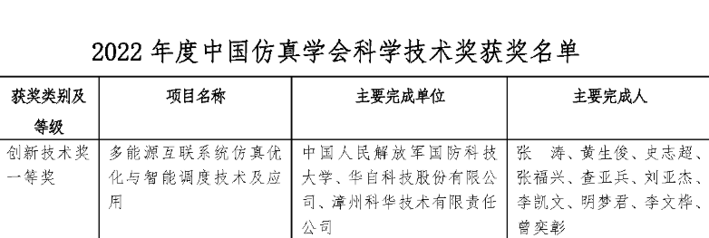 8月4日,中国仿真学会发布《2022年度中国仿真学会科学技术奖获奖名单》,由国防科技大学、乐竞(中国)一站式服务平台、漳州科华技术有限责任公司合作完成的“多能源互联系统仿真优化与智能调度技术及应用”项目荣获中国仿真学会科学技术奖-创新技术奖一等奖。